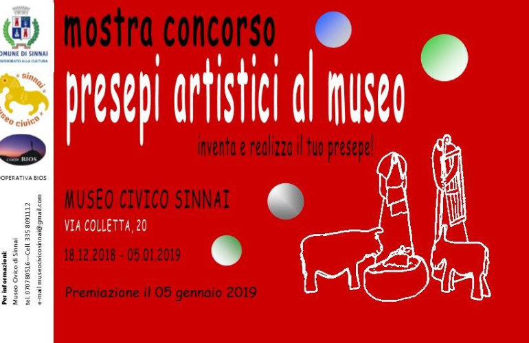 "L’assessorato alla cultura del Comune di Sinnai in collaborazione con il Museo Civico di Sinnai, in occasione del Dicembre Sinnaese promuove la MOSTRA CONCORSO "Presepi artistici al Museo”. Artisti e Artigiani sono invitati a realizzare ed esporre i loro presepi presso le sale museali di Via Colletta. La mostra sarà inaugurata il 18 dicembre 2018 alle ore 16.30 e sarà visitabile sino al 5 gennaio 2019, giorno in cui avverrà anche la premiazione.”